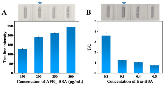 Optimization of AFB1-BSA concentration in line T (A) and Bio-BSA concentration in line C (B). (The star marking is the optimal condition).