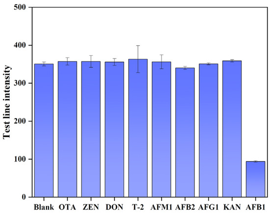 To further validate the specificity of the immunochromatographic test strip, eight common fungal toxins, OTA, ZEN, DON, T-2, AFM1, AFB2, AFG1, and KAN, were selected as interfering toxins for validation, and a positive control was set as the standard solution of AFB1, and a blank control was set as the sampling buffer. The above substances were diluted to 50 ng/mL, and 50 μL of each substance was taken for the spotting, which was repeated three times, and the T-line gray value was determined using an immunochromatographic. The results are shown in Figure 8. Five interfering toxins in high-concentration condition test-strip T-line color intensity compared to the blank value showed almost no change. The AFB1 standard spot sample test-strip T-line color intensity compared to the blank value decreased significantly, indicating that the immunochromatographic test strips constructed in this experiment and the other five fungal toxins do not have cross-reactions and have a very strong specificity for AFB1.