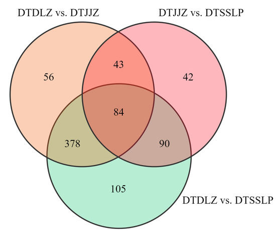 Venn diagram of differential metabolites among DTDLZ vs. DTSSLP, DTJJZ vs. DTSSLP, and DTDLZ vs. DTJJZ comparison groups.