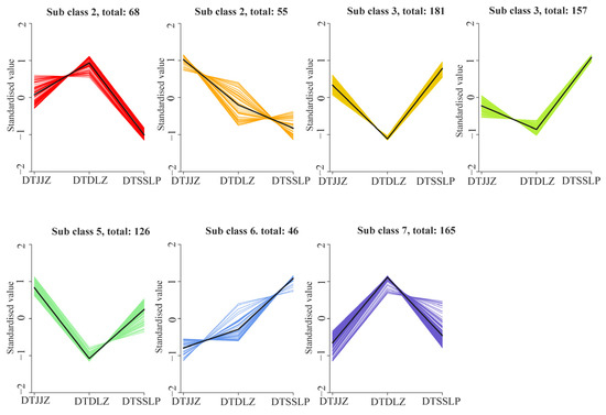 In order to evaluate the difference in the relative intensity of differential metabolites among different regions of H. citrina, all differential metabolites were subjected to unit variance scaling. A total of 899 differential metabolites were categorized into seven subclasses using the K-means clustering method. As shown in Figure 5, the relative intensity trends of metabolites in class 1 and class 7 were roughly similar, with the highest content observed in DTDLZ. However, the metabolite content of class 1 in DTSSLP was the lowest, while that of class 7 in DTJJZ was the lowest. Notably, class 1 and class 7 contained 68 and 165 differential metabolites, respectively, with the highest proportions being amino acids and derivatives, and flavonoids. Classes 3, 4, and 5 exhibited similar trends in relative intensity, with the lowest content found in DTDLZ. However, the contents of metabolites in class 3 and 4 metabolites were the highest content in DTSSLP, whereas that of class 5 metabolites were the highest in DTJJZ. Classes 3, 4, and 5 contained 181, 157, and 126 metabolites, respectively, with the highest proportions being amino acids and derivatives with lipids, amino acids and derivatives with flavonoids, and amino acids and derivatives with nucleotides and their derivatives. Additionally, the differential metabolites present in class 2 had the highest relative intensity in DTJJZ and the lowest in DTSSLP, while class 6 showed the opposite trend. Class 2 comprised 55 metabolites, and class 6 included 46 differential metabolites, with the highest proportions being amino acids and derivatives, and phenolic acids. Overall, among 798 differential metabolites, 384 were highest in DTSSLP, 233 were highest in DTDLZ, and only 181 were highest in DTJJZ.