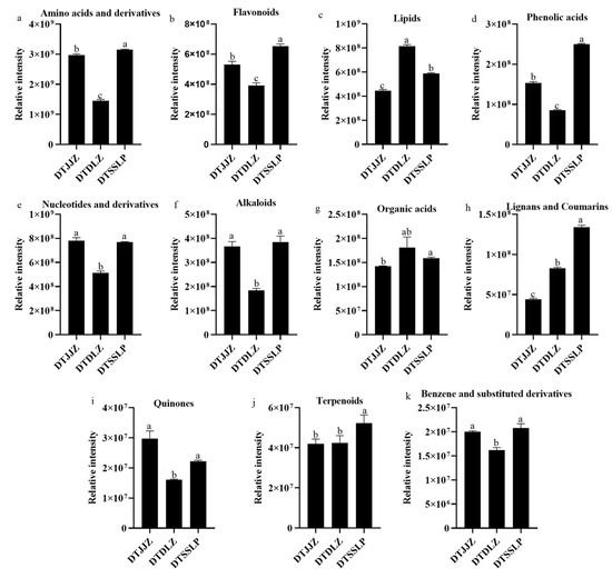 Relative intensity of metabolites with different classifications in different producing areas of H. citrina. (a): amino acids and derivatives; (b): flavonoids; (c): lipids; (d): phenolic acids; (e): nucleotides and derivatives; (f): alkaloids; (g): organic acids; (h): lignans and coumarins; (i): quinones; (j): terpenoids; (k): benzene substituted derivatives. Different letters indicate a significant difference at a 95% confidence level.