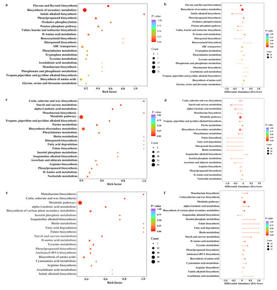 (a,c,e) KEGG pathway enrichment of differential metabolites between different comparison groups (DTDLZ vs. DTSSLP, DTJJZ vs. DTSSLP, DTDLZ vs. DTJJZ); (b,d,f) differential abundance (DA) score of differential metabolic pathways among different comparison groups (DTDLZ vs. DTSSLP, DTJJZ vs. DTSSLP, and DTDLZ vs. DTJJZ).