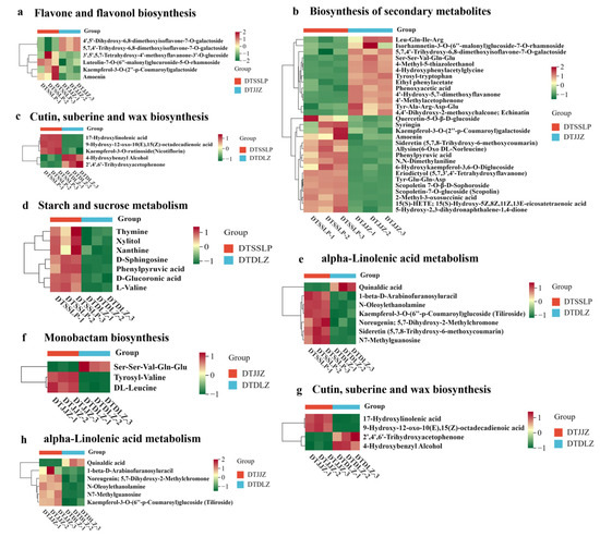 Heat map of enriched metabolites in the key KEGG pathway ((a,b) DTDLZ vs. DTSSLP; (c–e) DTJJZ vs. DTSSLP; (f–h) DTDLZ vs. DTJJZ).