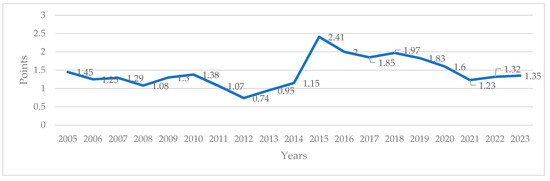Current liquidity, specifically, a business’s capacity to pay its short-term debt, is yet another factor that influences financial performance. Liquidity is affected by numerous factors, including the source of funds for financing assets and debts [46,47]. According to the literature, the current liquidity ratio should range from 1.5 to 2 [48]. Values below 1.3 indicate that a company does not have enough liquid assets to cover its short-term liabilities. In the Polish oil industry, the current liquidity ratio, namely, the ratio of short-term liabilities to current assets, fluctuated between 2005 and 2023. In 2005–2014, the analyzed parameter was below the recommended value. The situation changed in 2015 when the current liquidity ratio reached 2.41. In the following years, the examined parameter did not decrease below two (Figure 2). The liquidity ratio was lowest in 2012 (0.74) and 2013 (0.95), when oil producers experienced problems with meeting their current liabilities. Low liquidity can increase financial costs and discourage investors from trading a company’s assets [49].