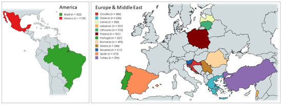 Figure 1 shows the geographical location of the countries, with 11 countries situated in Europe, one in the Middle East (Lebanon), and two on the American continent (Brazil in South America and Mexico in North America). Figure 1 also presents the number of participants in each of the 14 countries, summing to a total of 7222 participants. The highest number of participants was obtained in Mexico (n = 1139) and the lowest in Turkey (n = 296).