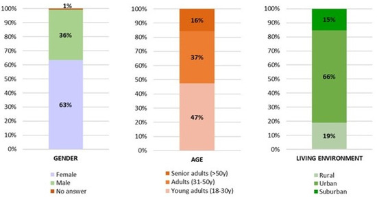 Figure 2 shows the distribution of the participants according to gender, age class, and living environment. More than half of the participants were female (63.5%), and concerning the age class, the most represented were young adults (47.4%) aged between 18 and 30 years old. Regarding the living environment, a majority lived in urban areas (65.6%), with lower percentages in suburban or rural areas (15.3% and 19.1%, respectively).