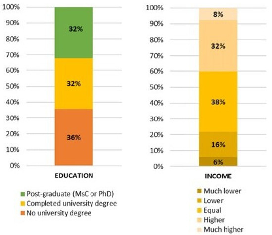 Figure 3 presents the participants according to education level and household income. The distribution according to education level was relatively even, with 35.8% of the participants having an education level below university, 32.3% having completed a university degree, and 31.9% having completed post-graduate studies—master’s or doctorate degrees. With respect to income, most participants reported a household income similar to the average income in their own countries (38.1%).