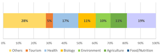 The professional activities of the participants are presented in Figure 4. Considering the subject of the research, some categories were preselected and presented to the participants to choose from. The participants could identify their professional activities linked with more than one option, for example, agriculture plus environment. From the participants who answered this question with one of the given options, a higher number responded Food/Nutrition (n = 2269), followed by Health professionals (n = 1991), and with lower representativeness appear professionals in the area of Tourism (n = 544).