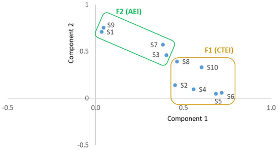 Figure 5 is a graphical representation of both factors considering the rotated space in the Cartesian coordinates system defined by both components of the FA. The graph shows the grouping structure that resulted from the FA, separating the two groups of variables, Factor F1 (CTEI) and Factor F2 (AEI).