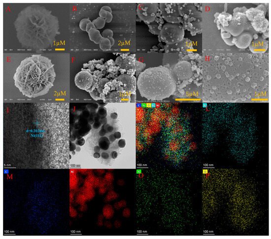 The surface morphology of the materials under different synthesis steps was determined using SEM. The nickel aluminum double hydroxide (NiAl-LDH) synthesized under hydrothermal conditions presents a petal-like shape consisting of nanosheets, as shown in Figure 1A. Glucose was hydrothermally hydrolyzed into carbon spheres (GC) at 180 °C, as shown in Figure 1B. As seen in Figure 1C, the GC surface acted as a nucleation substrate for Ni and Al ions under hydrothermal conditions in the presence of NH4F and urea, which hydrothermally formed granular double hydroxides on the surface of the carbon spheres, and in Figure 1D, it was found that petal-like double hydroxides were also formed on the surface of some of the carbon spheres, which verified that we had successfully grown the NiAl-LDH on the carbon spheres. After calcination at 800 °C for 2 h under the nitrogen atmosphere, the GC calcined a porous structure with some surface-loaded, relatively small double hydroxide particles embedded into the pores (Figure 1F–H). The high-resolution TEM image clearly shows the lattice surface of the Ni metal blob material on the surface of the carbon spheres, which was calculated and analyzed to be d = 0.202 nm, which coincides with (111) of the metal Ni annotation card (JCPDS card no. 04-0850) (Figure 1I). The distribution of various elements is observed through the EDS map of transmission electron microscopy (Figure 1G–J). It can be found that many small spheres are distributed on the surface of the carbon spheres (Figure 1J), and the elements C, Ni, Al, N, and O are uniformly distributed in the material (Figure 1G–K), where the Ni element is more obviously concentrated in the GC (Figure 1N).