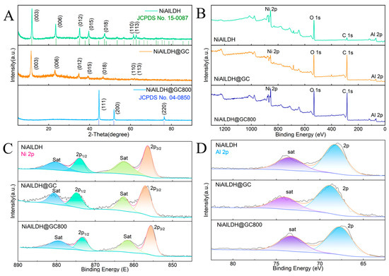 (A) XRD patterns of NiAl-LDH, NiAl-LDH@GC, and NiAl-LDH@GC800. (B) Overall spectrum for the NiAl-LDH, NiAl-LDH@GC, and NiAl-LDH@GC800. (C,D) XPS spectra of the Ni 2p, Al 2p.