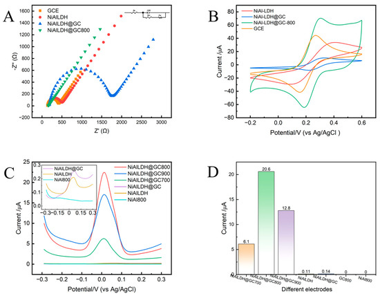 Further, the redox qualities of each electrode surface were evaluated using the CV method in a 5 mM [Fe(CN)6]3−/4− probe containing 0.1 M KCI [14]. As shown in Figure 3B, GCE, NiAl-LDH, NiAl-LDH@GC, and NiAl-LDH@GC800 exhibited a pair of redox peaks. Detailed CV data for the modified electrodes are presented in Table S1. Comparing the oxidation peak current (ipa) and the potential difference (∆Ep) between the redox peaks, GCE (∆Ep = 0.125 V, ipa = 58.71 µA), NiAl-LDH (∆Ep = 0.281 V, ipa = 25.63 µA), NiAl-LDH@GC (∆Ep = 0.127 V, ipa = 12.51 µA), and NiAl-LDH@GC800 (∆Ep = 0.113 V, ipa = 76.73 µA), we found that the redox peaks of NiAl-LDH and NiAl-LDH@GC are smaller than that of GCE, while NiAl-LDH@GC800 has the largest ipa and the smallest ∆Ep. This result indicates that NiAl-LDH@GC800/GCE has a fast charge transfer capability and excellent redox capacity, which is attributed to the synergistic effect of Ni bimetals reduced from NiAl-LDH by high-temperature calcination with porous carbon [48].