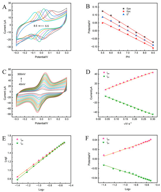The linear dependence of the peak current on scan rate is the characteristic of the oxidation and reduction of the substance adsorbed at the electrode surface. At the same time, we can deduce the mechanism controlling the reaction from the logarithmic relationship that exists between the redox peak and the scan rate [52]. When the slopes of the two are close to 1, it means that the process is controlled by adsorption. Figure 4E demonstrates the excellent linear relationship between the two: