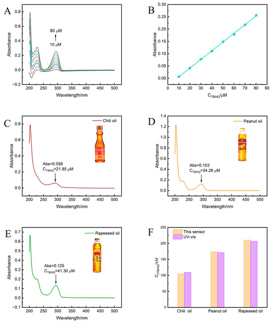 (A) UV–vis spectra of TBHQ standard solution (10–80 μM). (B) The linearity of absorbance versus TBHQ concentration. UV–vis spectra of (C) Chili oil, (D) Peanut oil, and (E) Rapeseed oil. (F) Comparison of TBHQ content in real samples measured by UV and sensor methods.