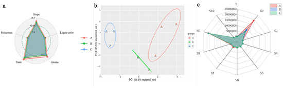 Sensory evaluation and electronic nose analysis of three grades of Lapsang Souchong black tea. (a) Radar chart displaying sensory scores. (b,c) Electronic nose evaluation results: (b) principal component analysis (PCA) illustrating the differentiation among grades; (c) radar chart depicting sensor responses. Grades A, B, and C correspond to special grade, first grade, and second grade, respectively.