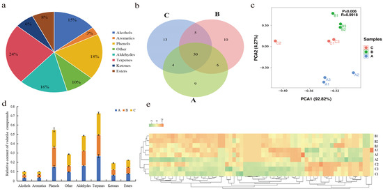 Analysis of volatile compounds and their classification in three grades of Lapsang Souchong black tea: (a) Doughnut chart illustrating the distribution of volatile compounds across all samples. (b) Venn diagram comparing the presence of compounds in grades A, B, and C. (c) Principal component analysis (PCA) showcasing the variance among the grades. (d) Relative abundance of various volatile compounds in grades A, B, and C. (e) Heatmap representation of the normalized relative content of each volatile compound, with rows corresponding to tea samples and columns to individual volatile components. Grades A, B, and C denote special grade, first grade, and second grade, respectively.