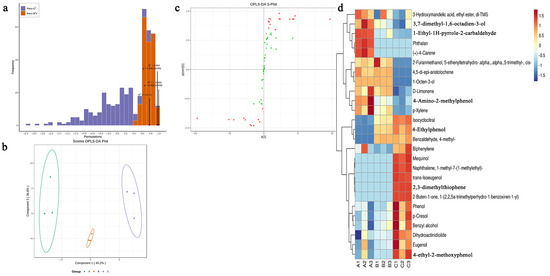 Identification of differentially volatile metabolites among grades A, B, and C: (a) OPLS-DA models assessing the goodness of fit for grades A, B, and C. (b) Validation of the OPLS-DA analysis for the three grades of Lapsang Souchong black tea. (c) Loading plot from the OPLS-DA analysis highlighting the volatile metabolites, where red dots indicate significant differences and green dots indicate non-significant differences. (d) Heatmap representing the differential metabolites across the three grades.