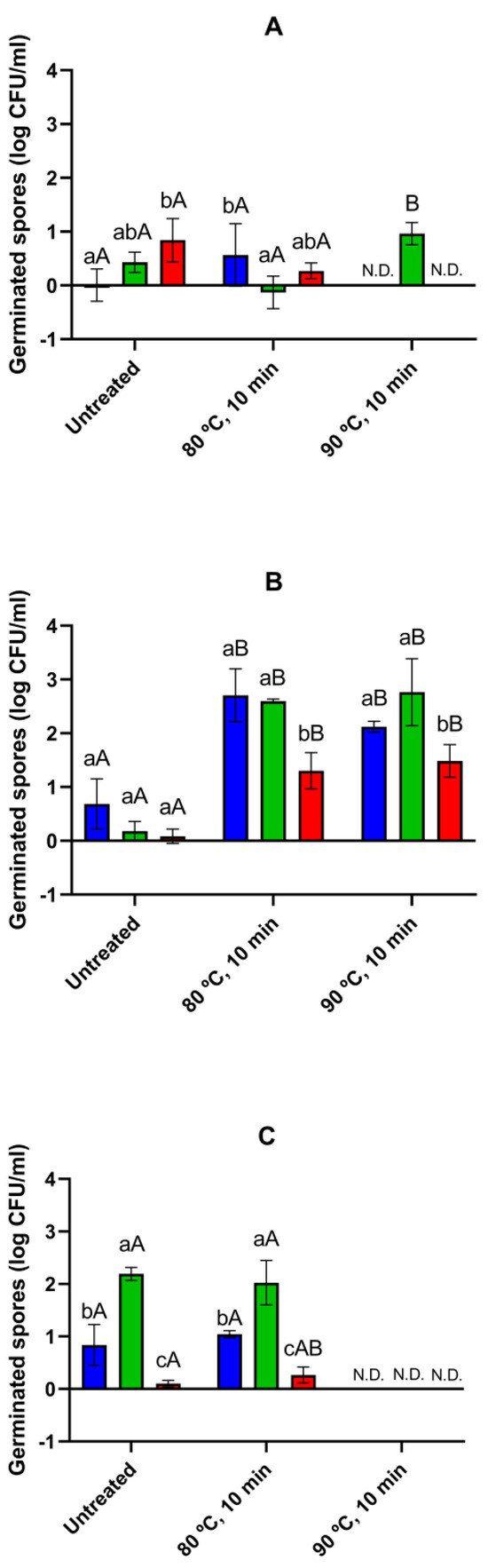 - Freire, V.; Condón, S.; Gayán, E. Impact of Sporulation Temperature on Germination of Bacillus subtilis Spores under Optimal and Adverse Environmental Conditions. Food Res. Int. 2024, 182, 114064. [Google Scholar] [CrossRef]