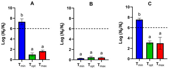 | Inosine (12.5 mM) + L-alanine (25 mM) | Tmin | 63.1 bC (3.4) | 96.3 bD* (0.5) | 91.0 aB (5.1) | ≥98.0 B* | 88.5 bC (5.2) | 33.5 bA* (13.1) |