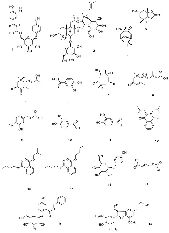 The structures of the identified compounds (Figure 3) were identified as 6′-O-caffeoylarbutin (CA) (1) [28], ginsenoside Rg1 (2) [29], (+)-epiloliolide (3) [30], pubinernoid A (4) [31], 3,9-dihydroxy-5,7-megastigmadien-4-one (5) [32], protocatechuic acid methyl ester (6) [33], chakyunglupulin B (7) [34], (2-trans,4-trans)-abscisic acid (8) [35], caffeic acid (9) [36], protocatechuic acid (10) [37], 3,4-dihydroxybenzaldehyde (11) [38], diisobutyl phthalate (12) [39], phthalic acid butyl isobutyl ester (13) [40], dibutyl phthalate (14) [41], arbutin (15) [42], trichocarpin (16) [43], adiadienedioic acid (17) [44], and (7S,8R)-3,3′,5-trimethoxy-4′,7-epoxy-8,5′-neolignan-4,9,9′-triol (18) [45], respectively. The NMR spectrum can be found in the Supplementary Materials.
