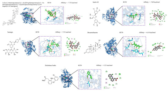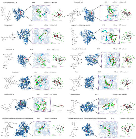 Oxidative stress, which involves free radicals and reactive metabolites, often results from elevated levels of free radicals or decreased levels of antioxidants [66]. Oxidation can adversely affect biomolecules, including DNA, lipids, and proteins, and is closely linked to various diseases, such as inflammation, aging, cancer, diabetes, Parkinson’s disease, and atherosclerosis [67,68]. Natural hypoglycemic components include polysaccharides, flavonoids, and alkaloids. We investigated the antioxidative and antimicrobial activities of compounds 36–67 and further explored their anti-inflammatory and hypoglycemic abilities in combination with compounds 1–35 using molecular docking (Table 4). A low BE indicates a high likelihood of receptor–ligand binding, high affinity, and greater stability. Compounds with BE > −6.5 kcal/mol were selected for anti-inflammatory and hypoglycemic molecular docking visualization, and after screening, anti-inflammatory had compounds 1, 2, 26, 33, 36–38, 40, 41, 43, and 63–67, and hypoglycemic compounds had (1, 2, 26, 37–41, and 63–67). The results of the anti-inflammatory visualization are shown in Figure 4 and Figure 5, and the results of the hypoglycemic visualization are shown in Figure 6.