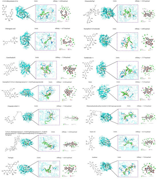 The bioactivity of C. fascicularis is noteworthy; however, it is limited by the low quality of the isolated secondary metabolites, which does not fully meet the criteria for bioactivity assessment. Molecular docking technology utilizes computational simulations to rapidly screen potential active compounds with high affinity for specific targets, such as enzymes and receptors. This virtual screening approach not only conserves substantial experimental time and resources but also significantly increases the efficiency of active compound discovery. The predictive outcomes of molecular docking depend on the accuracy of the model and the selection of computational methods, which are limited by current scientific advancements and computational capabilities. Consequently, predictions may sometimes not precisely reflect real-world scenarios, requiring further experimental validation [15,16,17]. Our research aims to provide a robust theoretical foundation and serve as a valuable reference for future researchers.