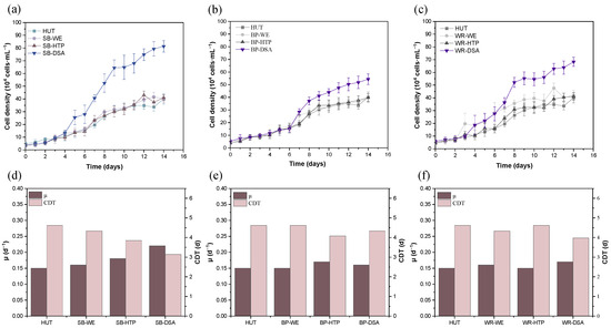 Growth performance of the E. gracilis in different fruit waste media under various treatments. (a–c) the growth curves in SB, BP, and WR, respectively; and (d–f) the μ and CDT in SB, BP, and WR, respectively. The error bars represent the standard deviation (n = 3).