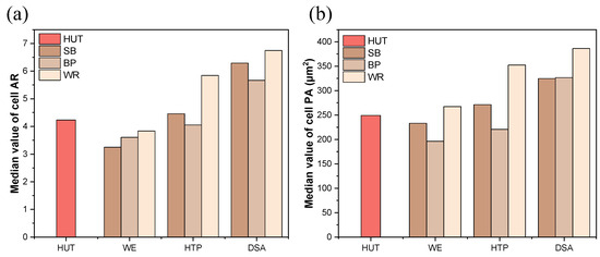 The cell morphology of E. gracilis in the different fruit waste media under various treatments. (a) Median value of cell AR. (b) Median value of cell PA. The values are represented by the median (n > 100).