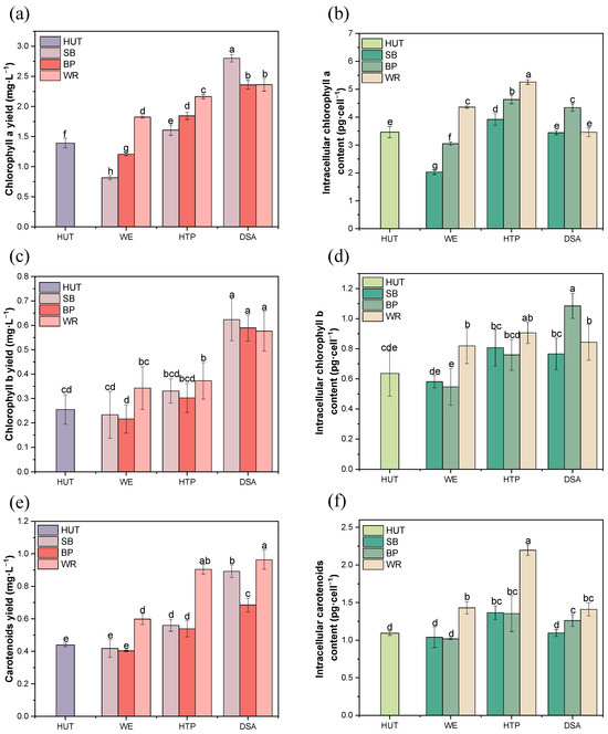 The pigment content per cell (Figure 3b,d,f) provided insights into the physiological state of the E. gracilis under different treatments. In the SB medium, the HTP treatment resulted in the highest cellular content of all three pigments, with increases of 1.13-fold, 1.27-fold, and 1.26-fold for the chlorophyll a, chlorophyll b, and carotenoids, respectively, compared to the control. This suggests enhanced light energy absorption and utilization efficiency under HTP treatment [13]. In the BP medium, the HTP treatment also yielded the highest cellular content of chlorophyll a and carotenoids (1.34-fold and 1.24-fold increase, respectively), while the DSA treatment resulted in the highest chlorophyll b content (1.69-fold increase). For the WP substrate, the HTP treatment led to the highest cellular content of all three pigments, with increases of 1.52-fold, 1.42-fold, and 2.02-fold for chlorophyll a, chlorophyll b, and carotenoids, respectively.