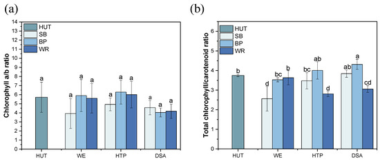 The total chlorophyll/carotenoid ratio was highest in the DSA treatment, indicating the strongest photosynthetic rate under this condition. In the WP medium, the HTP treatment yielded the highest chlorophyll a/b ratio among the treatments. The WE treatment resulted in the highest total chlorophyll/carotenoid ratio among the treatments, although all of the treatment groups showed lower ratios compared to the control.