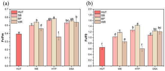 As illustrated in Figure 5, the Fv/Fm and Fv/F0 values exhibited significant variation across the different fruit waste substrates and treatments. In the SB medium, the HTP treatment group demonstrated the highest Fv/Fm and Fv/F0 values, indicating superior maximum photochemical efficiency and potential activity. The Fv/Fm value increased from 0.39 in the control group to 0.56 in the HTP group, while the Fv/F0 value rose from 0.65 to 1.24, representing increases of 1.44-fold and 1.91-fold, respectively. The DSA group showed lower Fv/Fm and Fv/F0 values compared to the HTP group, but these values were still higher than those in the control group. Similar trends were also observed with the BP medium, and the HTP treatment group again demonstrated the highest Fv/Fm and Fv/F0 values. Interestingly, in the WP medium, the DSA treatment group exhibited the highest Fv/Fm and Fv/F0 values, which were 1.20 times and 1.98 times higher than those of the HTP group, respectively.