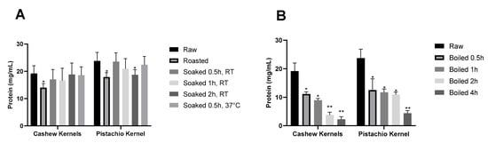 The extended boiling (1–4 h) induced remarkable reductions in the extractable protein concentrations for both cashew and pistachio in the current study (Figure 1B). In particular, the prolonged boiling at high temperatures reduced the solubility of cashew and pistachio proteins. For both cashews and pistachios, the soluble protein concentration decreased from 19.2 mg/mL and 23.8 mg/mL (raw) to 2.3 mg/mL and 4.4 mg/mL, respectively, when extensively boiled for 4 h (Figure 1B). According to Cuadrado et al., higher protein degradation is achieved when enzymatic hydrolysis after pressured heating is applied in both nuts [16,18]. Compared to the cashew nuts, which exhibited a significant decrease in soluble protein concentrations proportional to boiling time (i.e., from 19.2 mg/mL (raw) to 11.2 mg/mL, 9 mg/mL and 4 mg/mL when boiled for 0.5 h, 1 h, and 2 h, respectively), the pistachio exhibited a more stable protein concentration between boiling times up to 2 h (12.5 mg/mL for 0.5 h and 11 mg/mL for 2 h). Beyond 2 h, there was a significant reduction in soluble proteins (4.4 mg/mL), suggesting pistachio proteins were more resistant to heat.