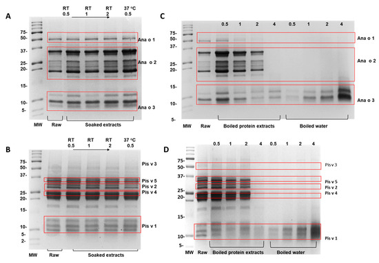 As with the soaking samples, the protein profiles of the boiled-water samples of cashew and pistachio and raw kernel extracts were characterized using SDS-PAGE (Figure 2C,D). As demonstrated in Figure 2C, the disappearance of Ana o 1 and Ana o 2 bands illustrated that the extensive boiling of cashew kernels for 4 h significantly reduced the extractable protein probably due to decreased protein solubility of 7S globulin and 11S globulin. The concentration of Ana o 3 in boiled kernels was proportionally decreased with boiling time (Figure 2C), which was likely due to structural modifications such as denaturation, aggregation, or reactions with food components. In line with this, the boiled water contained increasing Ana o 3 concentrations from leaching of this allergen into the boiling water, reaching its highest quantity at 4 h. This was in line with previous studies that showed soluble protein leakage from nut kernels into the treated water when peanuts were boiled [21,22].