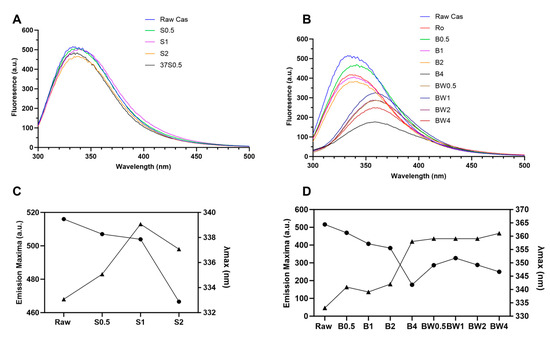 Fluorescence emission spectrum of (A) soaking-treated and (B) boiled-cashew samples. The maximum fluorescence intensity of cashew protein. (C) Fluorescence emission maxima (-•-) and λmax (-▴-) of soaked and (D) boiled for 0.5, 1, 2, and 4 h. Cas: cashew; Ro: roasted cashew; S: soaked raw kernels (0.5, 1, and 2 h at RT and 0.5 h soaked at 37 °C); SW: soaked water (0.5, 1 and 2 h); B: boiled cashew (0.5, 1, 2 and 4 h); BW: boiled water (1, 2 and 4 h).
