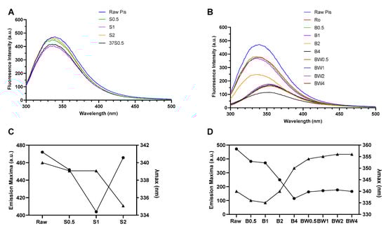 Fluorescence emission spectrum of (A) soaking-treated and (B) boiled pistachio samples. The maximum fluorescence intensity of pistachio protein: (C) fluorescence emission maxima (-•-) and λmax (-▴-) of soaked and (D) boiled for 0.5, 1, 2, and 4 h. Pis: pistachio; Ro: roasted; S: soaked; SW: soaked water; B: boiled; BW: boiled water.