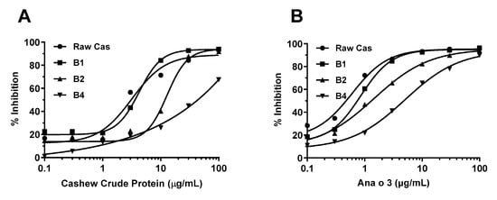Inhibition of raw cashew protein by heat-treated cashew proteins in the inhibition ELISAs using sheep anti-cashew proteins polyclonal antibodies and rabbit anti-Ana o 3 polyclonal antibodies. (A) Inhibition ELISA using sheep anti-cashew proteins antibodies with heat-treated cashew proteins for 1, 2, and 4 h (B1, B2, and B4). (B) Inhibition ELISA using rabbit anti-Ana o 3 antibodies with heat-treated cashew proteins for 1, 2, and 4 h. Raw cas indicates raw (untreated) cashew proteins.