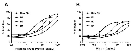 Inhibition of raw cashew protein by heat-treated pistachio proteins in the inhibition ELISAs using sheep anti-cashew proteins polyclonal antibodies and rabbit anti-Ana o 3 polyclonal antibodies. (A) Inhibition ELISA using sheep anti-cashew proteins antibodies with heat-treated pistachio proteins for 1, 2, and 4 h (B1, B2, and B4). (B) Inhibition ELISA using rabbit anti-Ana o 3 antibodies with heat-treated pistachio proteins for 1, 2, and 4 h. Raw pis indicates raw (untreated) pistachio proteins.
