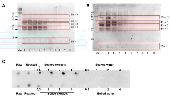 (A) SDS-PAGE and (B) IgE-immunoblot of pistachio protein extracted from raw, roasted, boiled nut, and boiled water: MW = standard protein marker. Lane 1 = raw pistachio protein extracts. Lane 2 = roasted-pistachio-extracted proteins. Lane 3 = 0.5 h boiling kernel proteins. Lane 4 = 1 h boiling kernel proteins. Lane 5 = 2 h boiling kernel proteins. Lane 6 = 4 h boiling kernel proteins. Lane 7 = 0.5 h boiling water. Lane 8 = 1 h boiling water. Lane 9 = 2 h boiling water. Lane 10 = 4 h boiling water. Same loading protein amount for SDS-PAGE. IgE-immunoblot was performed using pooled serum from cashew allergic patients. (C) IgE-dot blot of pistachio protein extracted from raw, roasted, treated nut, and treated water (indicated in the legend).