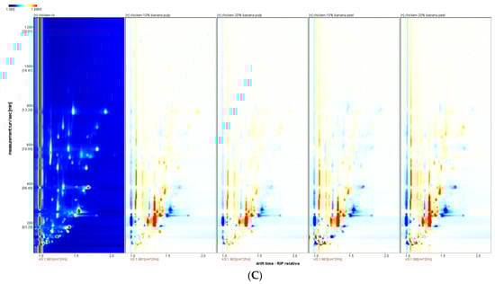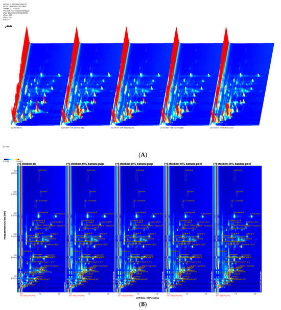 Figure 1B,C illustrate the two-dimensional spectrum of the gas–ion migration of the meat samples. The reactive ion peaks in the plots were subsequently normalized. Each data point to the right of the reactive ion peak represents a flavor compound present in the meat samples. The red points indicate a higher signal intensity, whereas the white spots indicate a lower signal intensity. The signal intensities, thus, represent the concentrations of the aforementioned flavor compounds. The meat sample from the CK group was utilized as a reference point. The ratio of a flavor compound in the meat samples of the supplementary group was identical to the reference ratio, which is indicated by a white spot after the deduction. The red and blue points indicate ratios that exceeded the reference value.