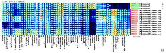 The cluster heat map revealed that 2-methylbutyric acid, 2-methyl-1-butanol, 3-hydroxy-2-butanone, and compound 2 were the flavor compounds exclusively identified in the supplementation groups and not in the control group. Furthermore, (E)-2-octenal D was also a less prominent flavor compound in the CK group. In contrast, the distinctive flavor compounds identified in the control group’s meat sample were 1-pentanol, heptanal D, hexanal, pentanal, 1-octen-3-ol M, and N-nonanal M. However, the meat samples of the chickens fed with the diets containing fermented banana peels exhibited lower amounts of these flavor compounds.