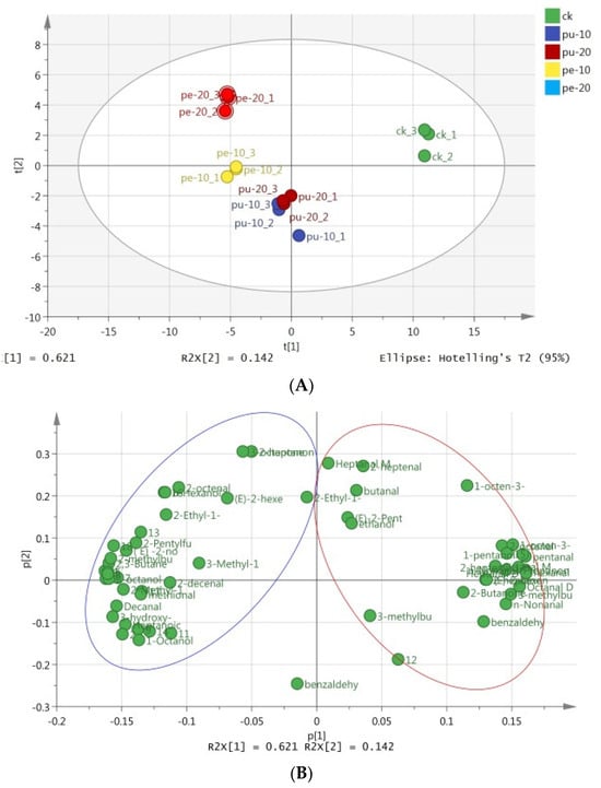 PCA (A) scores and (B) loading plot in the chest meat samples of the experimental groups.