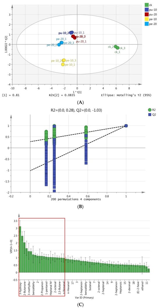 The peak information of flavor compounds in chest meat samples was initially standardized to remove the unit limitation of the data and then converted into a pure value without dimension. This approach allows for the lower peak index to be achieved without compromising the flavor value or undermining the reliability of the result. The results of the OPLS-DA analysis of these substances in the meat samples are presented in Figure 4. The total variance was 89.35%, the R2Y value was 99.1%, and the Q2 value was 94.2%. The flavor compounds in the meat samples were distributed across three of out the four quadrants, with the Pu-10, Pu-20, and Pe-20 groups situated in the second quadrant (with the exception of Pe-20-2), the Pe-10 group in the first quadrant, and the CK group in the fourth quadrant (Figure 4A). A permutation test was conducted as part of the analysis. Subsequently, the experimental data were randomly rearranged by modifying the sorting order of the categorical variable (Y), and Q2Y was randomly assigned up to 200 times to validate the model.
