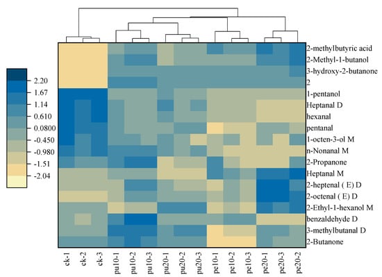 The OPLS-DA model was employed for the purpose of analyzing the characteristic flavor compounds present in the chest meat samples. A hierarchical cluster analysis was conducted on the 18 characteristic flavor compounds with a VIP score greater than 1. The heat map of these flavor substances was presented to illustrate the clustering of the flavor compounds (Figure 5). The light- to dark-colored squares of the heat map were used to indicate the relative levels of characteristic flavor compounds, with low levels represented by light squares and high levels represented by dark squares. The hierarchical cluster analysis (HCA) yielded two categories, the first of which included the control group (CK) and the second of which included the supplementary groups (Pu-10, Pu-20, Pe-10, and Pe-20).