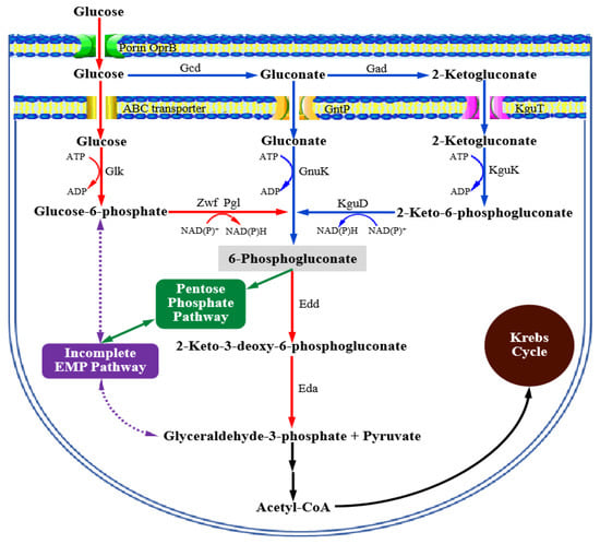 The genus Pseudomonas bacteria have the glucose oxidation system located in the periplasmic space, which is mainly composed of membrane-bound pyrroloquinoline quinone (PQQ)-dependent glucose dehydrogenase (Gcd) and FAD-dependent gluconate dehydrogenase (Gad). The Gcd and Gad successively oxidize glucose to gluconic acid and gluconic acid to 2KGA in the periplasmic space [5,6,7,8]. Most interestingly, members of the genus Pseudomonas show significant adaptation, survival, and persistence capacities in response to environmental cues and stresses, which are beneficial for their industrial processes [9,10,11,12,13]. Pseudomonas bacteria have a specific glucose phosphorylation system that generates 6-phosphogluconate from glucose via three parallel pathways [14,15]. Glucose, gluconate, and 2KGA in the periplasmic space could be transported into the cell cytoplasm by the specific corresponding ATP-dependent transporters [16]. Generally, glucose enters the cell cytosol through an ABC transporter and is phosphorylated to glucose-6-phosphate by glucokinase (Glk), then further converted to 6-phosphogluconate (6-PG) via the sequential activity of glucose-6-phosphate-dehydrogenase (Zwf) and 6-phosphogluconolactonase (Pgl). The second pathway involves the transport of gluconic acid by gluconate permease (GntP), following the direct phosphorylation of gluconic acid to 6-PG mediated by gluconokinase (GnuK), and the third pathway, also called the 2KGA loop, involves the transport of 2KGA via 2-ketogluconate transporter (KguT) into cytosol, phosphorylation to 2-keto-6-phosphogluconate (2K6PG) via 2KGA kinase (KguK), and conversion into 6-PG via 2K6PG reductase (KguD). The absence of 6-phosphofructo-1-kinase (Pfk) in the genus Pseudomonas leads to the incomplete Embden–Meyerhof–Parnas pathway (EMP pathway). Hence, the glucose metabolism in genus Pseudomonas usually utilizes the ED-EMP route [14,15,16,17,18,19], which includes the Entner–Doudoroff pathway (ED pathway), pentose phosphate pathway (PP pathway), and partial EMP pathway (Figure 1). The metabolic flux analysis proved that over 90% of the consumed sugar was converted as 6-phosphogluconate in P. putida KT2440, which was further consumed in the ED pathway to 2-keto-3-deoxy-6-phosphogluconate (KDPG) by 6-PG dehydratase (Edd), further split by KDPG aldolase (Eda) into two trioses, pyruvate (Pyr) and glyceraldehyde-3-P (Glc-3-P), for further metabolism [16,20,21]. Less than 10% of 6-phosphogluconate entered the PP pathway, proving that the ED pathway plays the predominant role in glucose uptake in the genus Pseudomonas [19,21].