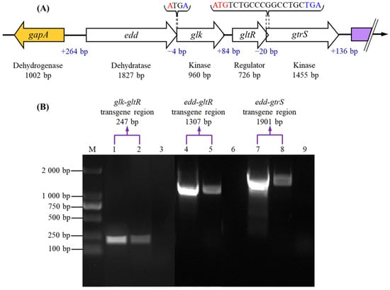 P. plecoglossicida cells were collected after cultivating in seed media for 12–14 h at 32 °C and 265 rpm. The total RNA was extracted and purified using the bacteria total RNA extraction kit and RNase-free DNA removal kit (Sangon Biotech, Shanghai, China). The cDNA was prepared by reverse transcription using a FastKing RT Kit (with gDNase) (TIANGEN, Tianjin, China). The co-transcriptions of edd, glk, gltR, and gtrS were checked using the designated primers of G1/G2, G3/G4, and G5/G6 (Table S2) to clone the transgene fragments of glk-gltR, edd-gltR, and edd-gtrS with P. plecoglossicida JUIM01 genome DNA (positive), DI water (negative), and cDNA as the templates.