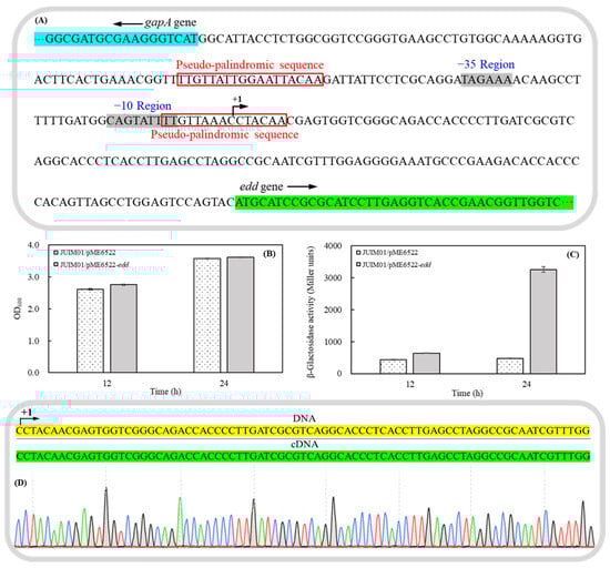 The prediction of the promoter region of the edd operon (A), a comparison of the cell growth (B) and β-galactosidase activities (C) between JUIM01/pME6522 and JUIM01/pME6522-edd after 12 h and 24 h cultivation, and the determined transcription start site of the edd operon by 5′-RACE (D).