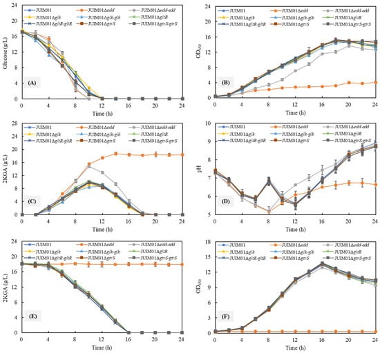 The structural gene-knocked mutants of JUIM01Δedd, JUIM01Δglk, JUIM01ΔgltR, and JUIM01ΔgtrS (Figure S6) and their complemented strains of JUIM01Δedd-edd, JUIM01Δglk-glk, JUIM01ΔgltR-gltR, and JUIM01ΔgtrS-gtrS (Figure S8) were constructed, respectively, to elucidate the roles of edd, glk, gltR, and gtrS genes in the 2KGA metabolism of P. plecoglossicida JUIM01. Figure 4A–D present the differences in the cell growth and 2KGA metabolism of the parent strain P. plecoglossicida JUIM01 and the structural gene-knocked and complemented strains when using 20 g/L of glucose as the sole carbon source. The knockout of glk, gltR, or gtrS had no significant changes in glucose utilization, cell growth, 2KGA synthesis and consumption, or pH levels in broth. Interestingly, the deletion of edd and the complementation of edd to the JUIM01Δedd strain benefited the glucose consumption rates of over 1.8 g/L/h, which increased by 20% compared to the parent strain. The edd-knocked strain JUIM01Δedd showed a high 2KGA production efficiency of the produced 2KGA concentration of 18.2 g/L and could not use the produced 2KGA as the sole carbon source (Figure 4E,F). The deletion of edd resulted in a remarkable reduction in cell concentration and growth rate with the maximum cell concentration of 2.35 g/L (OD650 nm = 4.08) compared to those of the parent strain with the maximum cell concentration of 8.56 g/L (OD650 nm = 14.89). Corresponding to an efficient 2KGA production performance, the pH of JUIM01Δedd broth also showed a significant difference from that of JUIM01.