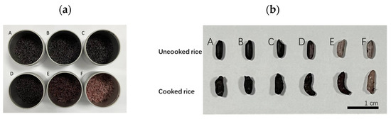 A total of 30.00 g black rice with different milling degrees (A–F) was firstly washed 3–4 times and soaked for 30 min. The rice, at a rice to water ratio of 1:1.4 (w/w), was cooked for 40 min and insulated for 10 min.