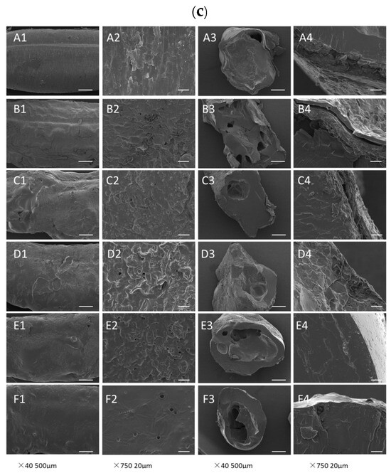 The Yangxian black rice is classified as a medium-grain rice, with a length breadth ratio (L:B) of 2.1 to 3.0 (Figure 1a,b). The milling degree for each sample (A–F) was calculated as 0.00% (A), 0.57% ± 0.02% (B), 1.27% ± 0.02% (C), 4.16% ± 0.04% (D), 6.97% ± 0.14% (E), and 10.19% ± 0.10% (F). Given that the bran layer accounted for about 10% of the entire grain weight [19], the refined black rice (F) was approximately considered as having the bran layer removed. Since the pigment is concentrated in the outer bran layer, the color of cooked black rice gradually fades with increasing milling degree. The structure of cooked black rice samples was observed through SEM (Figure 1c). Distinct morphological differences in the integrity of surface and transverse sections of rice kernels were observed in black rice samples subjected to varying milling degrees. The surface and transverse sections revealed that the outer bran layer progressively flakes off and the inner endosperm is gradually exposed with the increasing milling degree. The appearance of holes in transverse sections was caused by starch gelatinization during cooking [28,29,30].