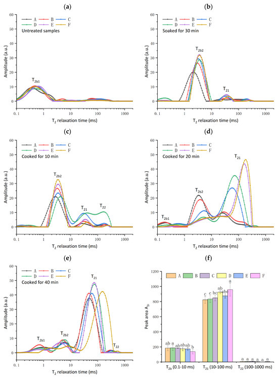 Distributed T2 relaxation time of black rice with different milling degrees (A: 0%, B: 0.57%, C: 1.27%, D: 4.16%, E: 6.97%, F: 10.19%) under different stages (untreated samples (a), soaked for 30 min (b), cooked for 10 min (c), 20 min (d), 40 min (e)), and peak area A2i of black rice cooked for 40 min (f). Different superscript letters in the bar graph represented statistically significant differences (p < 0.05).
